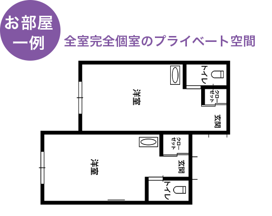 各部屋トイレ・洗面台・クローゼット付きのプライベート空間。